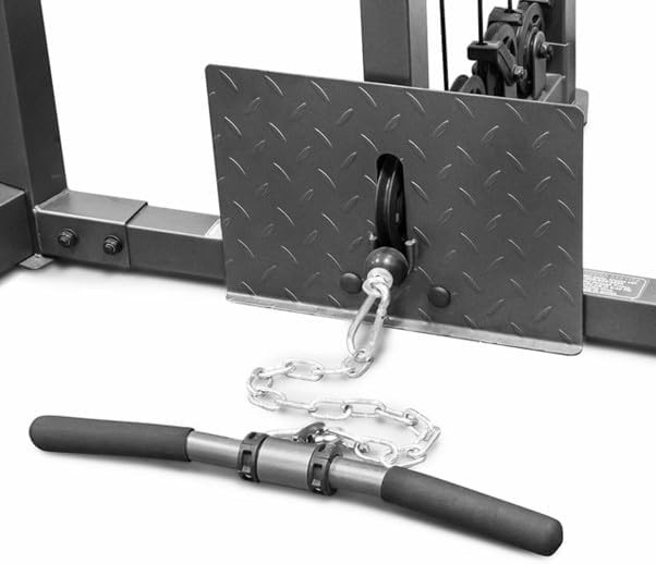 - Workout Station Includes: Cable system, pull-up bars, cross pulleys, shiver bar, ankle strap, link chains, 2 handles, and V bar with an upper pulley cable crossover