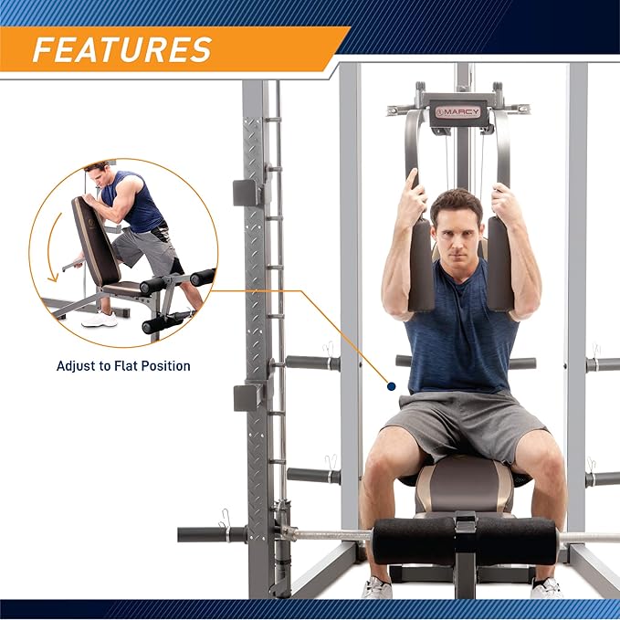 Marcy Smith Cage Machine with Workout Bench and Weight Bar Home Gym Equipment SM-4008