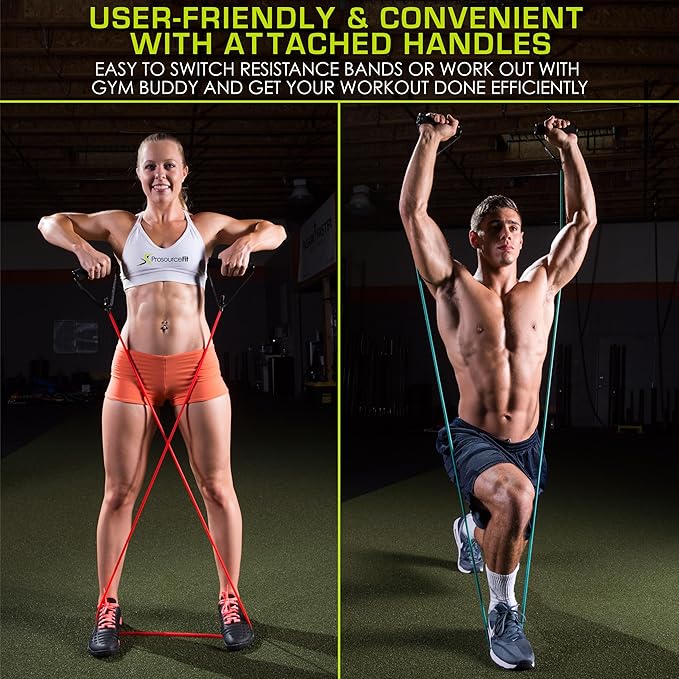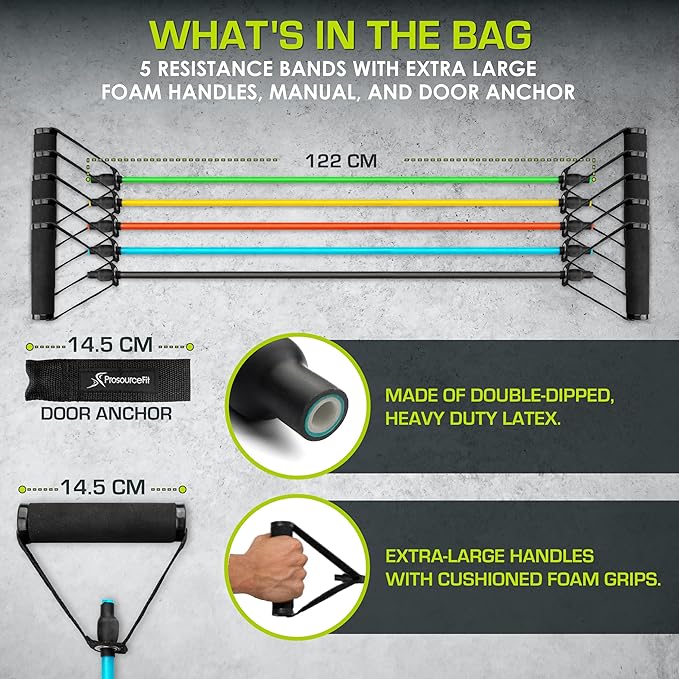 - CUSTOMIZABLE - 5 color-coded, 48-inch bands with attached comfortable foam handles provide various strength levels and exercises in one set: Green (2-5 lb), Yellow (5-8 lb), Red (8-12 lb), Blue (12-16 lb), Black (16-20 lb)