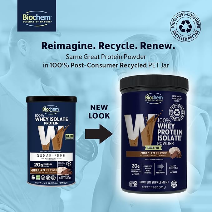 Biochem 100% Whey Sugar-Free Chocolate 20g, 12.5oz, Certified Vegetarian, Certified Gluten Free, Certified Non-GMO Tested, Keto Friendly, Grass-Fed