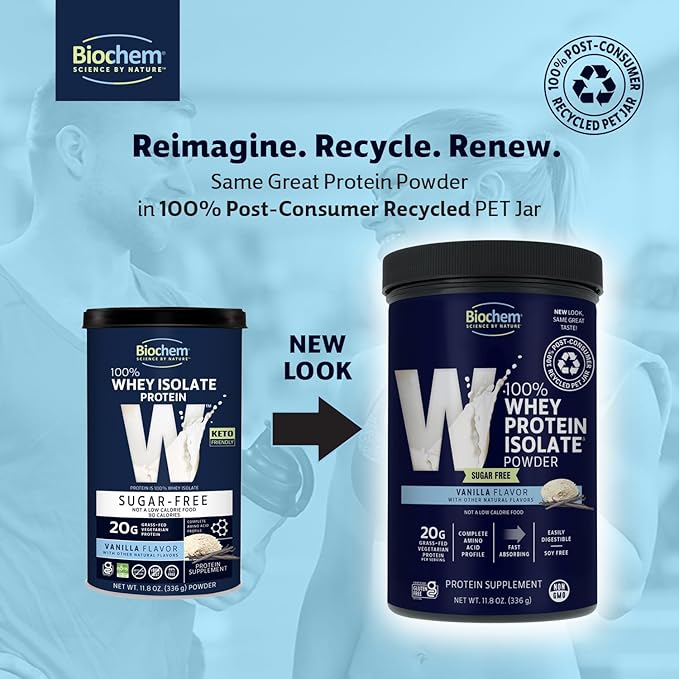 Biochem 100% Whey Sugar-Free Vanilla 20g, 11.8oz, Certified Vegetarian, Certified Gluten Free, Certified Non-GMO Tested, Keto Friendly, Grass-Fed
