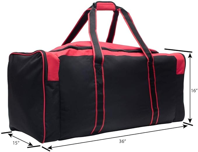 - Large main opening; end pockets fit skates and accessories