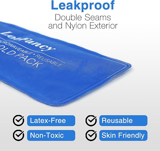 - SAFE, FLEXIBLE AND REUSABLE: Soft gel pack is filled with non-toxic CMC & glycerin, latex-free, reusable, safe for all ages to use; Stays flexible and pliable even when frozen; Double sealed with a thick nylon exterior to prevent leaking; FSA HSA Eligible