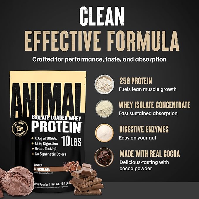 Animal Whey Isolate Protein Powder - Loaded for Pre & Post Workout Muscle Builder and Recovery with Digestive Enzymes for Men & Women - 25g Protein, Great Taste, Low Sugar - Chocolate 10 lbs