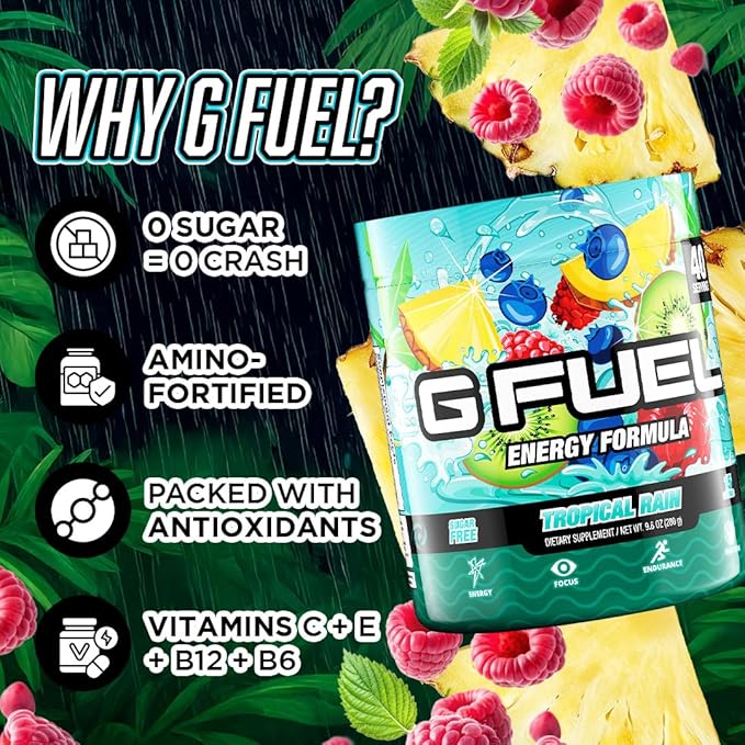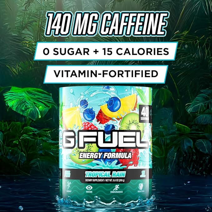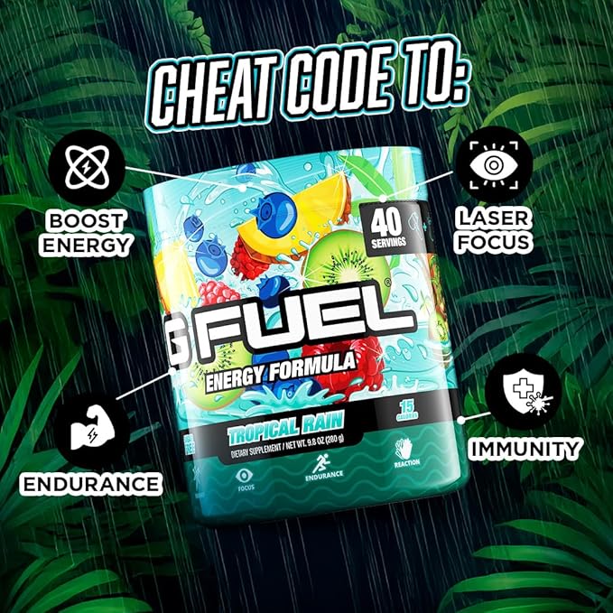 - TROPICAL RAIN FLAVORED: Normal rain is cool and all, but then there’s G Fuel's Tropical Rain energy drink mix. An ultra-refreshing, mouth-watering, pineapple & raspberry medley that will teleport you straight to the middle of a remote rainforest. Let it rain.