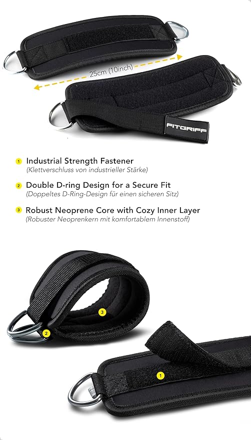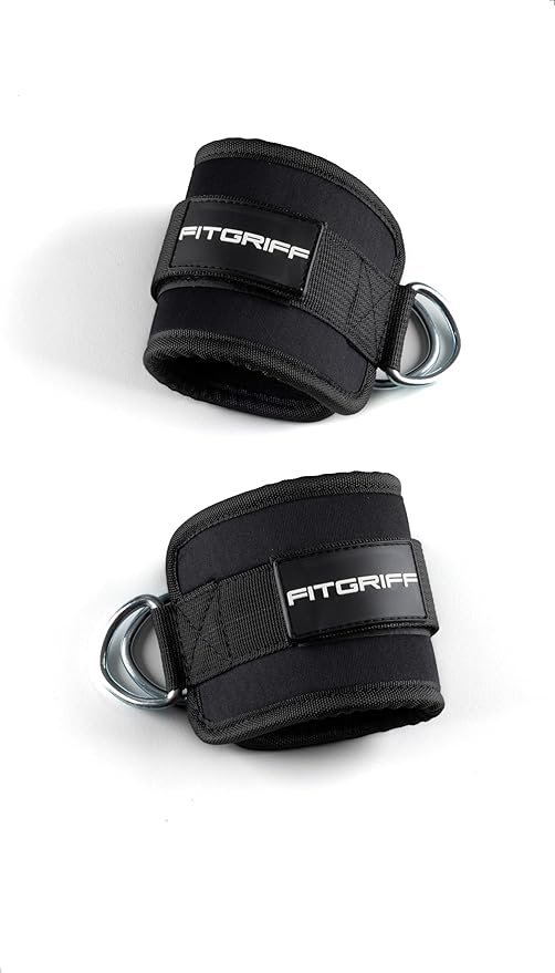 - BUILT TO LAST - Crafted for durability, FITGRIFF's Ankle Straps boast industrial-strength Velcro, reinforced seams, and premium construction. Their innovative design includes double D-rings to ensure an even distribution of weight, providing steadfast support through every rep and set.