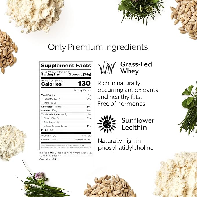 - Whole Food-Based Ingredients: Made of grass-fed whey (rich in naturally occurring antioxidants and healthy fats), sunflower lecithin (naturally high in phosphatidylcholine), vanilla extractives, and coconut sugar (lower glycemic index, minimally processed natural sweetener). That’s it.