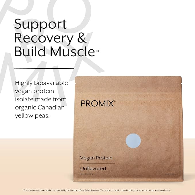 - Support Recovery and Build Muscle: Promix Vegan Protein Powder is a highly bioavailable vegan protein isolate made from organic Canadian yellow peas. This light- and smooth-tasting powder is easy to digest and blend. Grown and processed in North America. Unflavored. 38 servings per container, 2 scoops per serving.