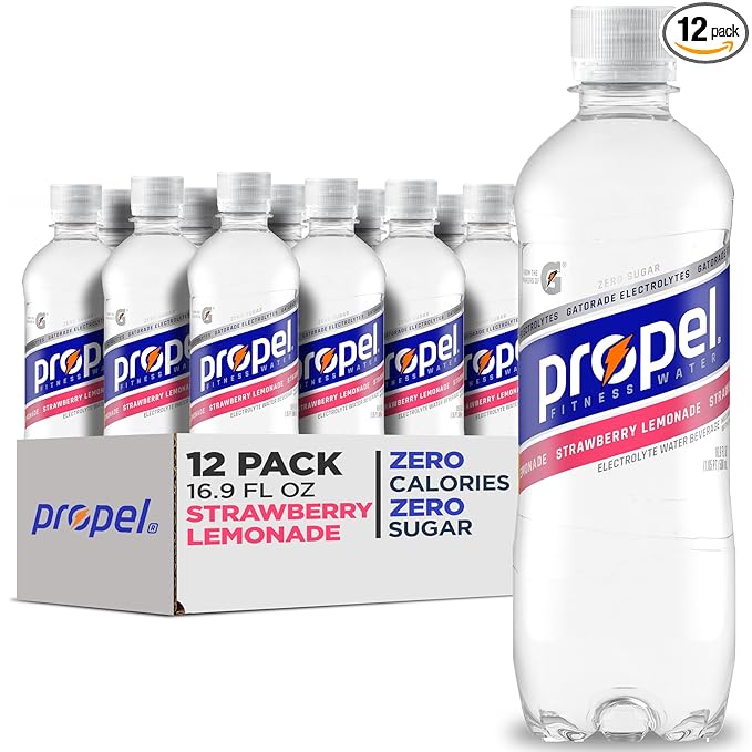 - Includes 12 (16.9 fl oz) bottles of Propel Electrolyte Enhanced Water, Strawberry Lemonade flavored water with Zero Calories, Zero Sugar, Electrolytes for Hydration, and Vitamins C & E