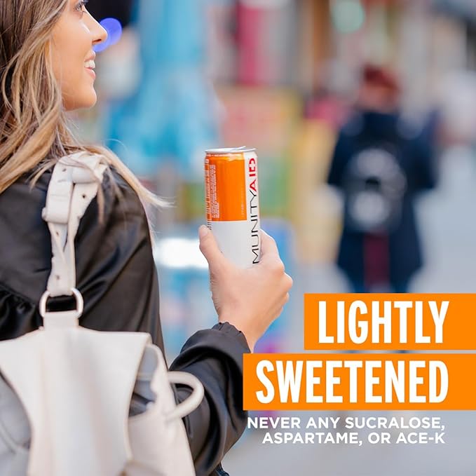 - Ditch the Sugar. Only 45 calories per can, IMMUNITYAID is naturally sweetened with just a pinch or raw organic agave—lightly carbonated, with a refreshing "Orange Boost" flavor