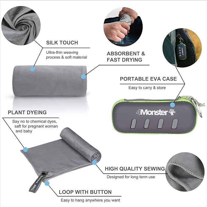 4Monster Camping Towel Super Absorbent-Quick Dry Microfiber Towel Ultra Compact & Soft-Travel Towel Lightweight for Backpacking,Hiking,Gym,Beach,Swimming,Yoga