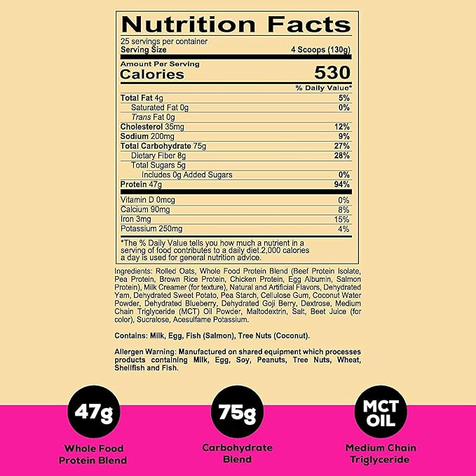 - Professional Grade Formula - REDCON1's MRE protein powders contain a whole food high protein blend of beef, salmon, chicken, egg, brown rice and pea protein powders. Each meal replacement protein powder shake is 530 calories with 47g of protein and only 5g of sugar in your new favorite meal replacement powder.