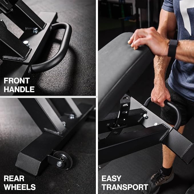 - EASY TO TRANSPORT: This space-efficient gym bench is perfect for any room, featuring sturdy transport wheels and a handle for effortless grip and mobility.