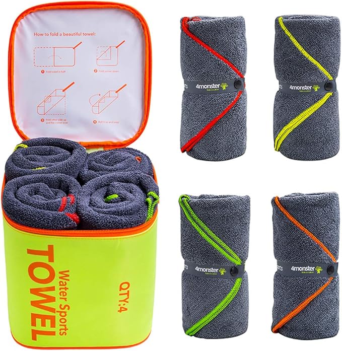 4Monster 4 Pack Microfiber Camping Towel Quick Dry, Super Absorbent Travel Towel with Waterproof Bag, Lightweight Boat Towel for RV, Sport, Gym, Beach, Pool, Swim,Family Trip