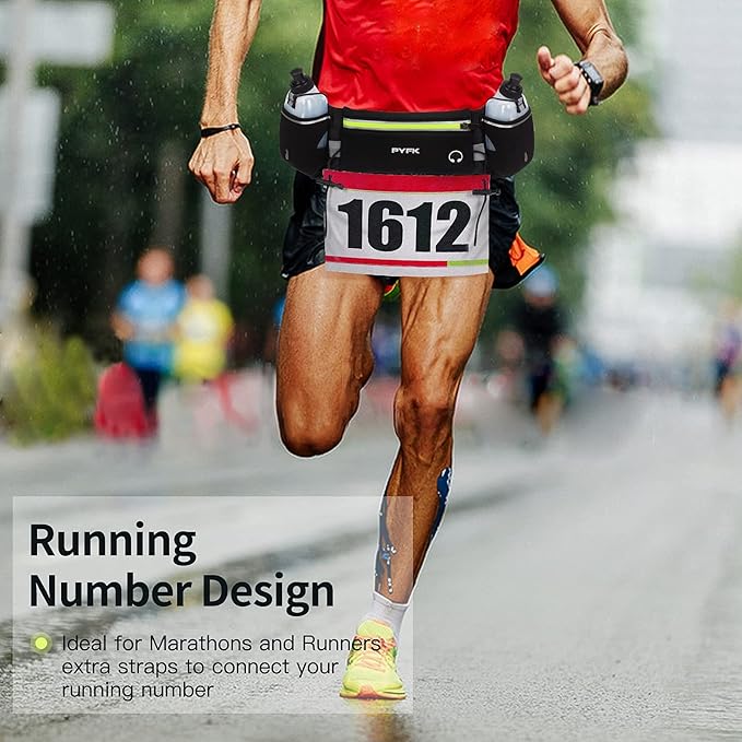 - ๐PROFESSIONAL DESIGN:1. Adjustable strap that comfortably fits waist from 25 inches to 60 inches. 2. There is a hole to insert the headphone, enjoy the music during running. 3. Two extra pockets to carry the water bottle and the strap above the pocket can secure the water bottle. 4. You are noticeable at night because of the reflector straps printed on the belt. 5. This runners water bottles has straps to attach a race number so it makes a great race number belt or tri race belt.