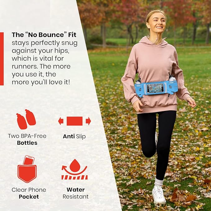 - ✔️ HYDRATION BOTTLES INCLUDED: Stay hydrated on the go – This blue dual-pocket hydration belt helps you get the most out of every walk, run, hike, or journey. Two BPA-free bottles provide 20 ounces of your favorite beverage, ensuring you never run dry.