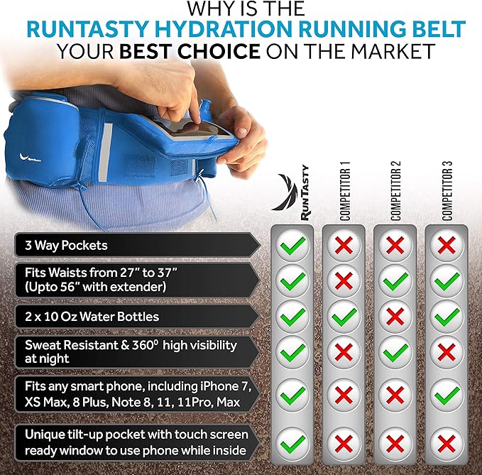No.1 Hydration Belt by Runtasty - Premium Running Fuel Belt w/2 BPA-Free 10 oz Water Bottles, Tilt-Up Pocket w/Touchscreen-Ready Cover - Fits All iPhones, Runners Ebook & No-Bounce Design