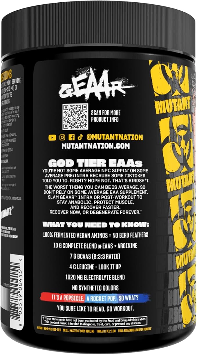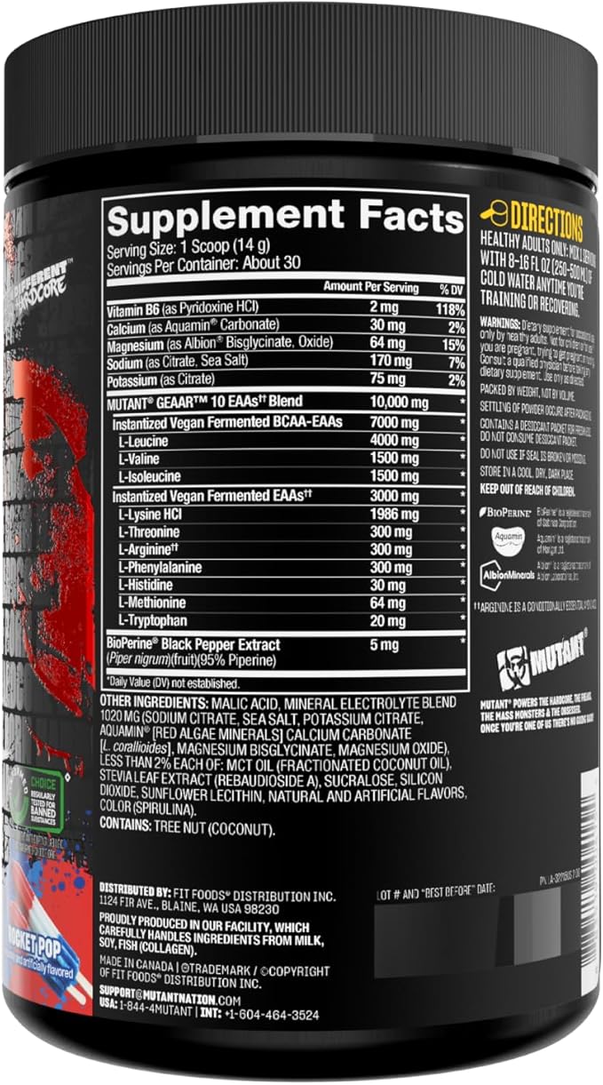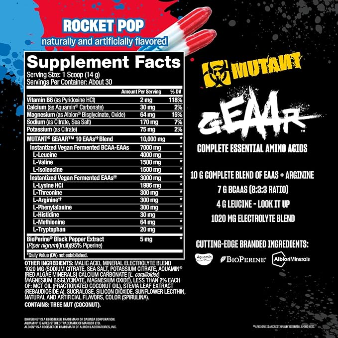 Mutant GEAAR - 9.4g of EAA Powder + Arginine, 7g BCAAs, 4g Leucine, Electrolytes, Coconut Water, No Artificial Colors or Flavors, Delicious Taste - 30 Servings - Rocket Pop - 400g