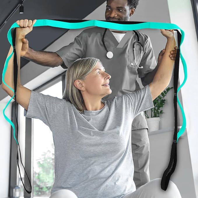 - 【BENEFIT】: Multiple hand-holds along the strap allows for progressive unassisted stretching with greater control. Use this stretch strap to prepare for daily activities, prevent injury, alleviate tightness, increase flexibility and improve range of motion.