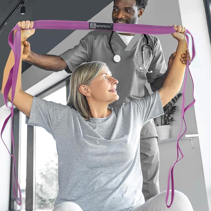 - 【BENEFIT】: Multiple hand-holds along the strap allows for progressive unassisted stretching with greater control. Use this stretch strap to prepare for daily activities, prevent injury, alleviate tightness, increase flexibility and improve range of motion.