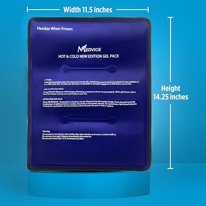 - ✅ DUAL REUSABLE COLD & HOT THERAPY - Multi-use cooling pack & heating pad that transfers heat and cold evenly to relieve acute and chronic pain, muscle pain, arthritis, menopause, inflammation, swelling, and aid injury recovery. Simply switch in between hot and cold - takes 60 minutes to freeze. Once room temperature, heat up in microwave for 40 seconds. Medvice hot and cold pack offer both hot and cold therapeutic support.