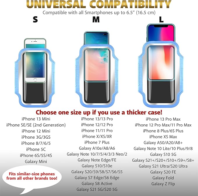 - [There's No Comparison] Our premium sports cell phone armband is designed to comfortably fit all Apple iPhones, Samsung Galaxy, Android, Pixel, LG, Moto, Huawei and other smartphones similar in size and dimensions. Accommodates all phone cases, too, including Otterbox, Lifeproof. Just size up if you're using a thicker phone case.