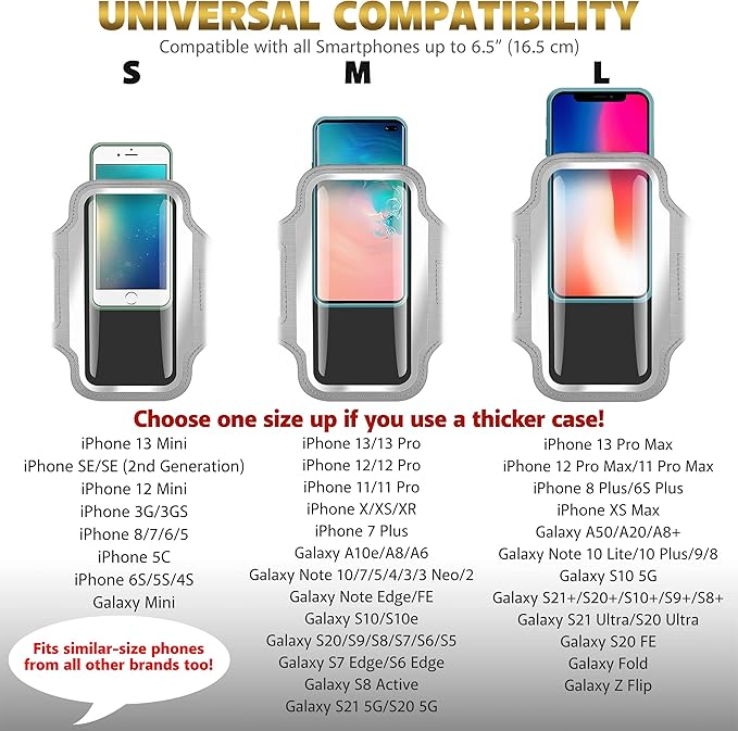 • [There's No Comparison] Our premium sports cell phone armband is designed to comfortably fit all Apple iPhones, Samsung Galaxy, Android, Pixel, LG, Moto, Huawei and other smartphones similar in size and dimensions. Accommodates all phone cases, too, including Otterbox, Lifeproof. Just size up if you're using a thicker phone case.