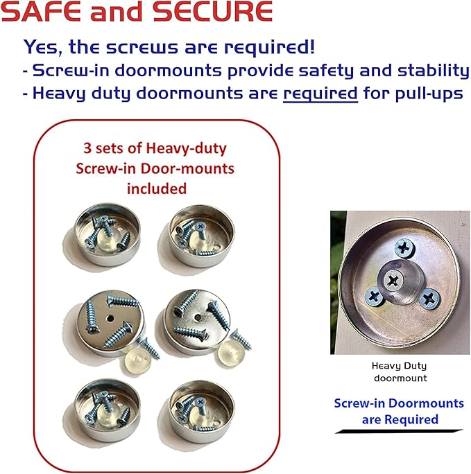 - Safe and Secure - Heavy-duty chrome steel doorway pull up bar and door mounts provide great support and safety. Note: Always install and use the supplied screw-in door brackets (comes with 3 sets of heavy-duty door mounts)
