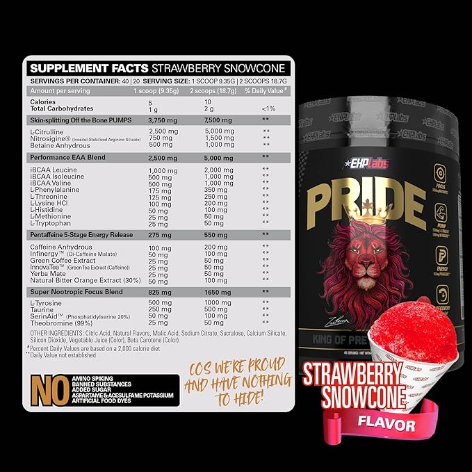 - Razor Sharp Focus - We all know of the importance of the mind muscle connection and our PRIDE Pre Work Out does not forget this! We have included a nootropic blend in this product to give your brain the ultimate boost! If you’re wanting to sharpen your mind while having the best workout of your life then PRIDE is the pre-workout for you!