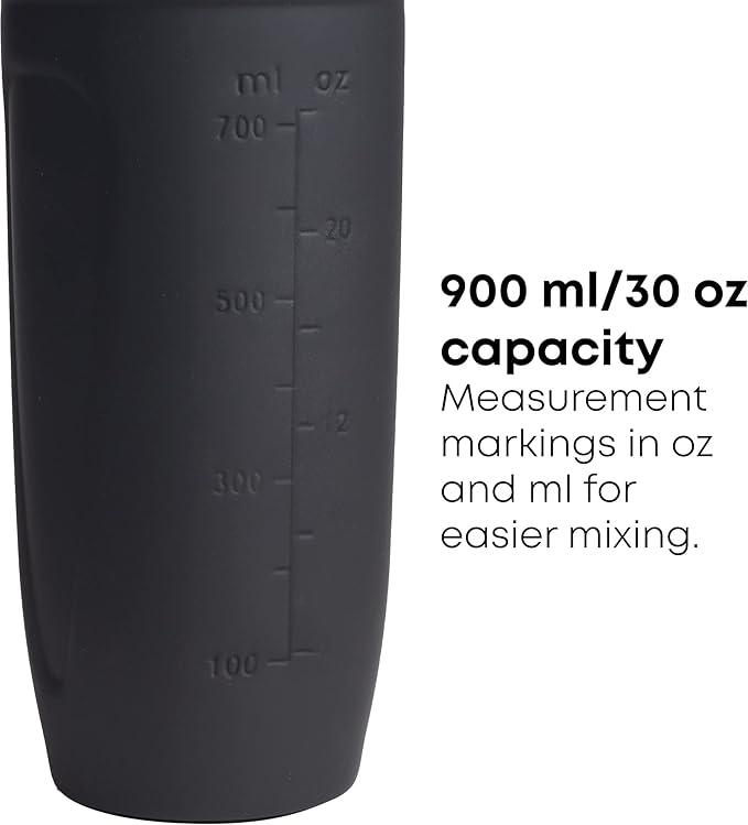 - DURABLE AND ROBUST. This large 900 ml shaker features a soft silicone base, a screw-on leak-proof lid, a soft loop handle and a smooth, matte gray powder-coated finish for a non-slip grip