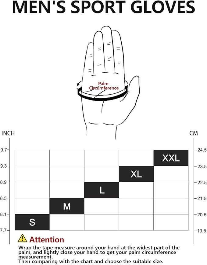 - NOTE: Wrap the tape measure around your hand at the widest part of the palm, and lightly close your hand to get your palm circumference measurement. Then comparing with the chart and choose the suitable size. If you are between sizes, please choose one size bigger
