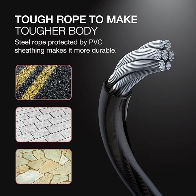 - Durable and Adjustable Length Steel Rope: Durable steel rope protected by premium PVC sheathing to avoid cracking or breaking. This rope is built to last. This jump rope is adjustable and can be adjusted quickly according to your height. Suitable for both adults and children