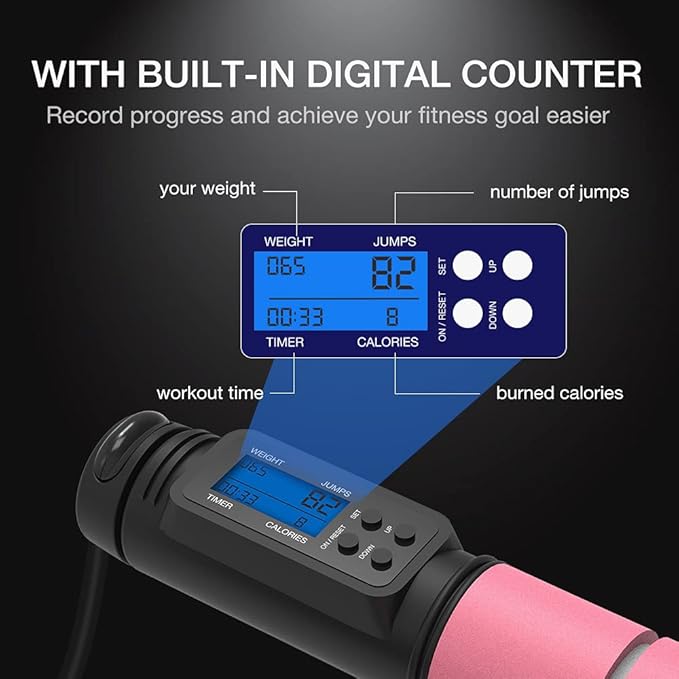 - Jump Rope with Smart Counter: Designed with HD LED display, which shows Timer, Weight, Calorie and Circles. It will record the number of circles you jump and show the calories been burn. Simply set your weight and workout to reach your fitness goal at any time