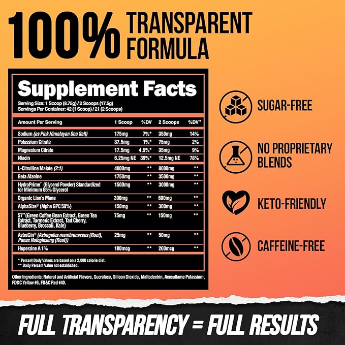 - Special Ingredients : L-Citrulline, HydroPrime™ Glycerol, S7™, AstraGin®