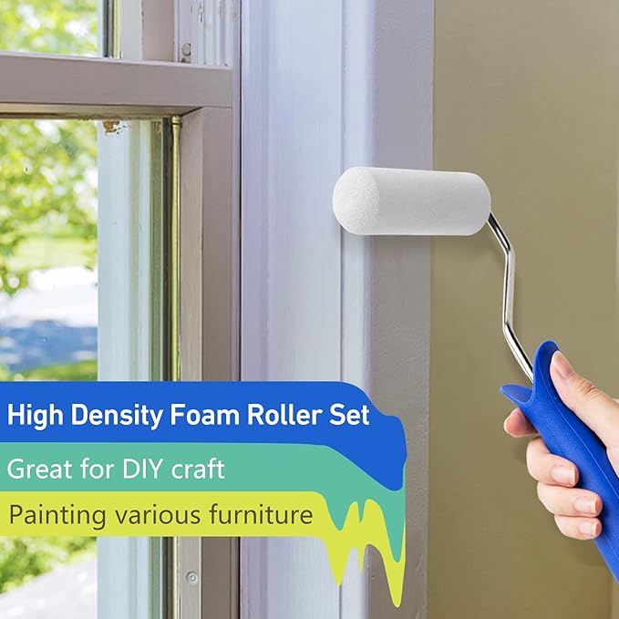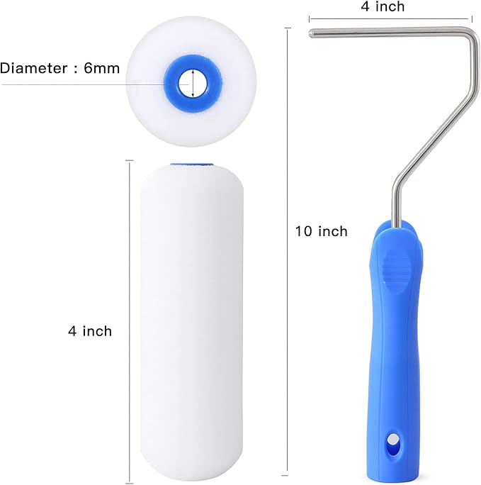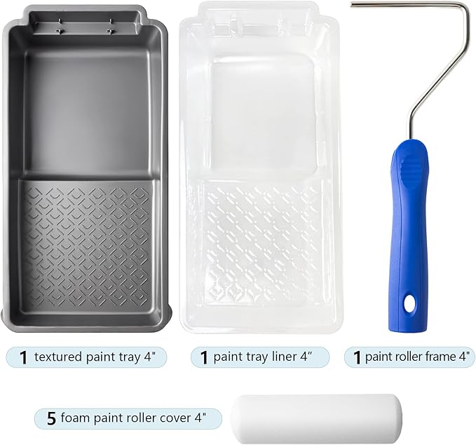 - Foam Paint Roller Kit: 4 Inch high density foam paint roller cover 5 pcs, 4 inch paint tray, 4 inch paint tray liner, 4 Inch paint roller frame
