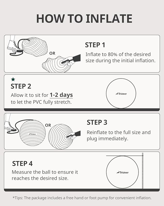 - [Easy Inflation and Perfect Packaging] -Trideer exercise ball comes with a quick inflation pump (45/55/65cm equipped with a hand pump; 75/85cm equipped with a foot pump), 2 air stoppers, and detailed instructions. Available in 5 sizes—45cm, 55cm, 65cm, 75cm, 85cm—to meet all your needs.