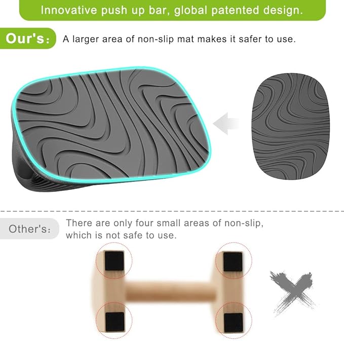 - Non-Slip Rubber Pad: There is a 5 1/2 * 7 9/10 inch large area rubber pad at the bottom, which is super anti-slip. Ensure that the push-up bar remains stable on various floor types without sliding, and higher safety protects you from injury during exercise