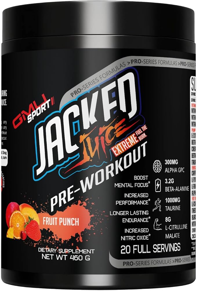 GMU SPORT Jacked Juice Pre Workout | Explosive Energy, Focus & Muscle Pumps | 8g Citrulline Malate, 3g Creatine, Beta Alanine, Alpha-GPC | 250mg Caffeine | 40 Servings Fruit Punch