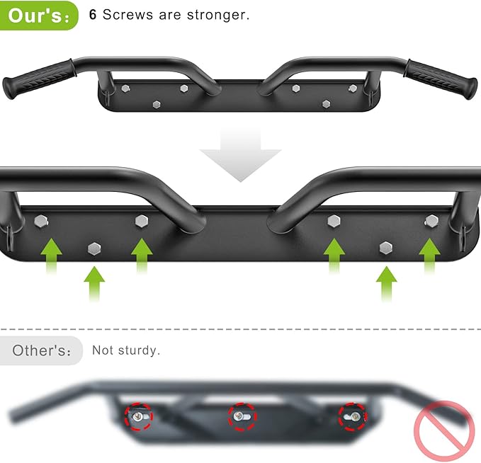 - ๐๏ธโโ๏ธใStable and Safe Wall MountใThis pull-up bar features a unique 6-hole design on the triangular base plate, which distributes the pressure evenly. Unlike other pull up bars with only 3 or 4 holes, our pull up bar offers more stability and safety for your exercise. It can support up to 440 lbs of weight without wobbling or shaking