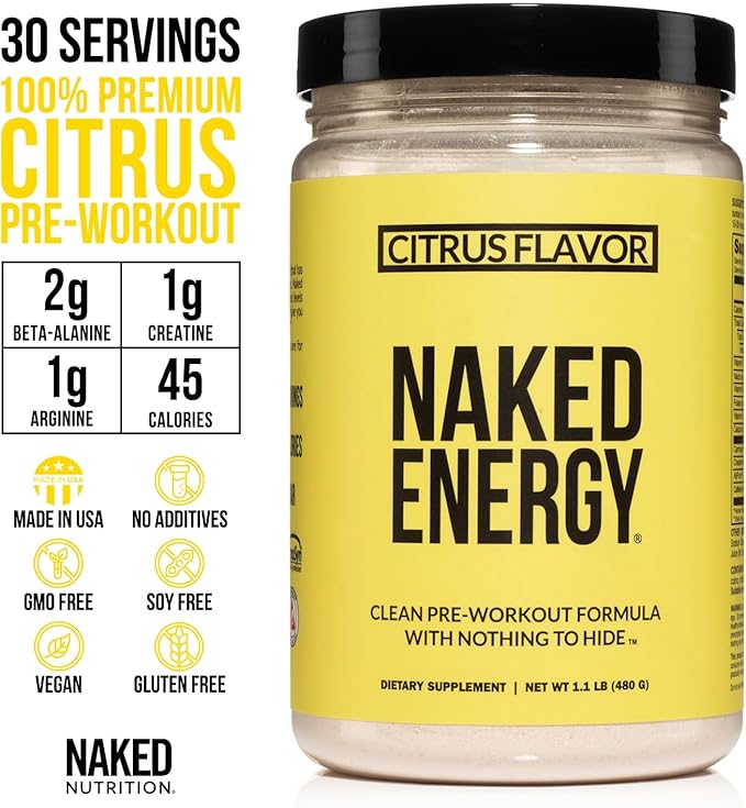 - PURE PRE WORKOUT POWDER: Citrus Naked Energy is a vegan pre workout powder manufactured in the USA with only 14 high-quality ingredients. Enjoy a citrus preworkout energy powder designed with your health in mind.
