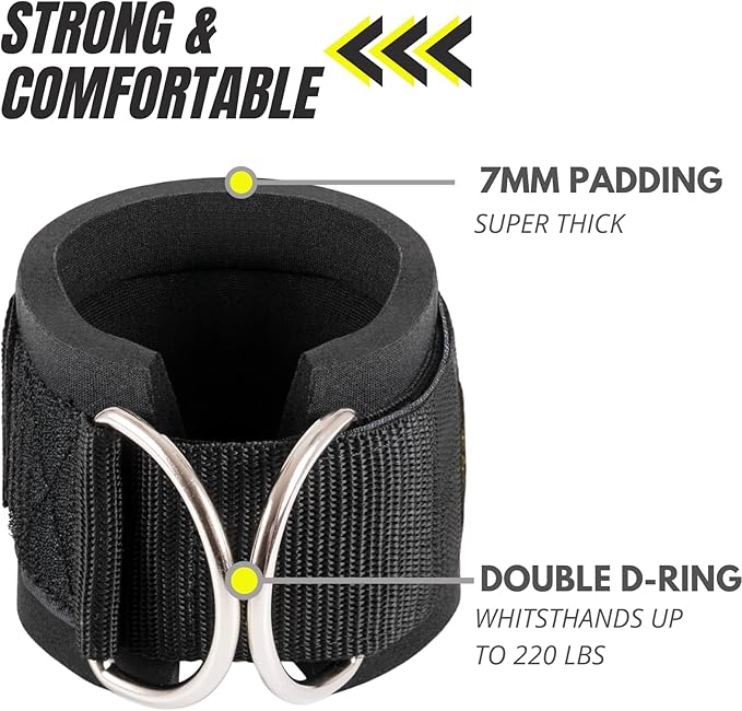 - Huge padding for Maximum Comfort: Other ankle cable attachments for gym are rough on the skin causing bruises, they rip off mid move or start breaking down due to weight. We took the old cable ankle straps concept and we upgraded it: 7 mm neoprene padding for comfort, double D-ring for weight lifting up to 220 lbs and heavy duty velcro for increased workout intensity without worrying for your safety