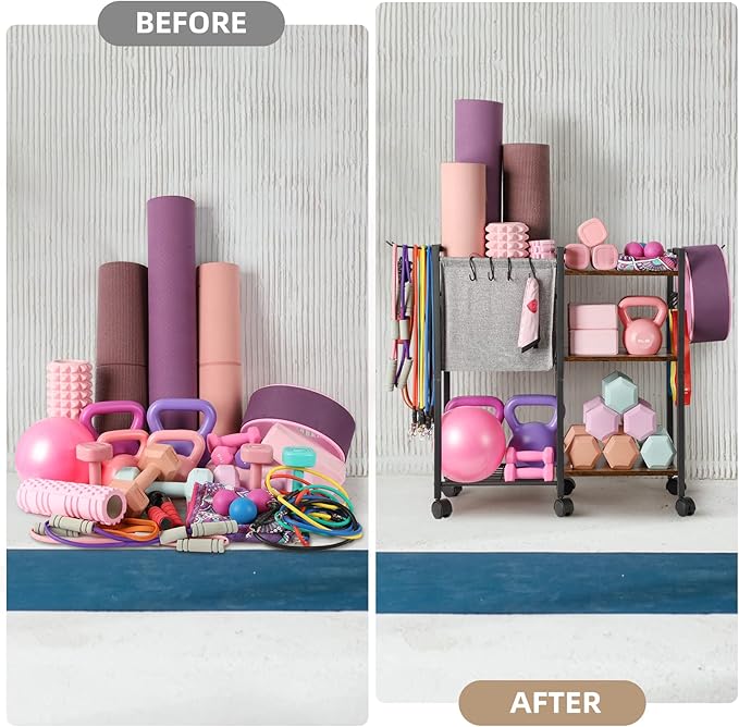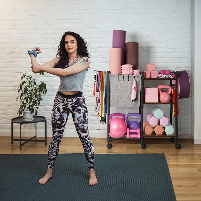 Yoga Mat Storage Rack Home Gym Equipment Organizer Holder for Foam Roller Dumbbells Kettlebells Resistance Bands and More Accessories Women Men Workout Organization with Hooks Wheels (Black)