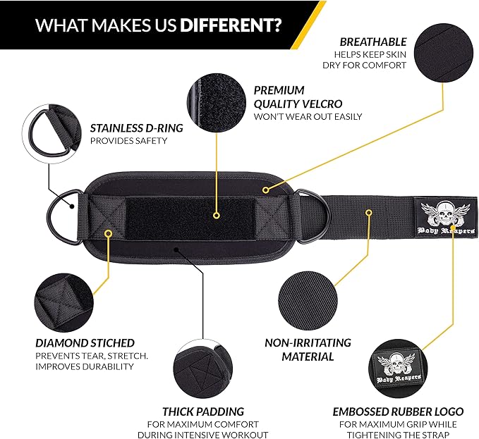 • DURABLE ANKLE STRAPS – Made with breathable neoprene, these ankle straps provide comfort and stability. Reinforced Double D-rings, strong velcro, and diamond-stitched under straps ensure these workout straps are built for all intensity levels.