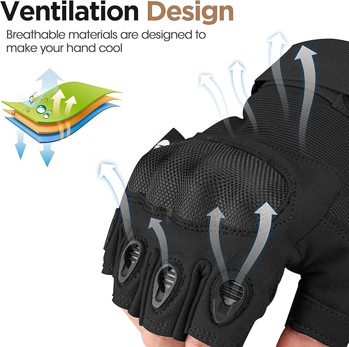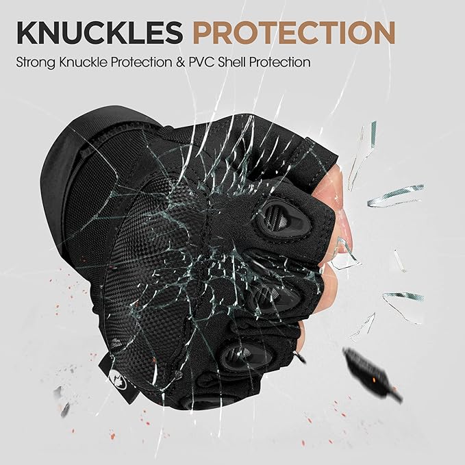 - Strong Knuckle Protection: These fingerless tactical gloves provide the right balance of flexibility and protection. The PVC shell at the knuckles of full-finger tactical gloves can increase the cushioning effect and resist the impact of sharp objects. The palm panel of climbing gloves is reinforced to withstand extra wear & tear with PU Leather