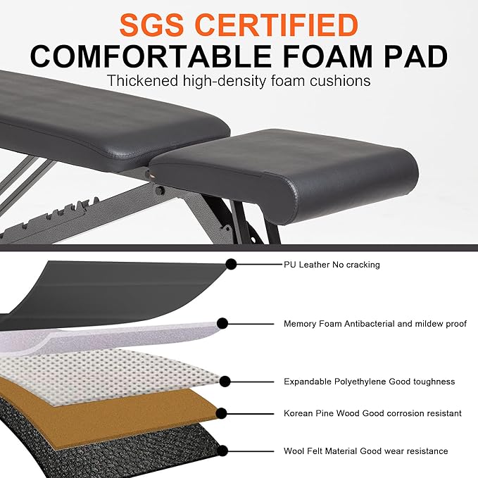 - [More adjustment angles] Designed with 8 back , 4 seat and 3 leg-hold-bar positions for full-body workout; You can quickly adjust the incline to suit your needs by simply pulling the self-rebound spring lock; Superior lock cylinder provides secure locking capability.
