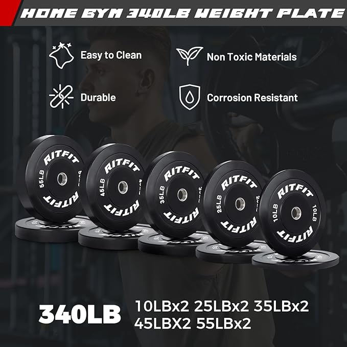 - What's in the package - RitFit Power Cage with Lat Pull Down System *1; RitFit Adjustable Weight Bench *1; RitFit 2 inch Olympic Barbell *1; RitFit 340LBS Olympic Bumper Plates Set (10lbs *2, 25lbs *2, 35lbs *2, 45lbs *2,55lbs *2); Free Collars *2