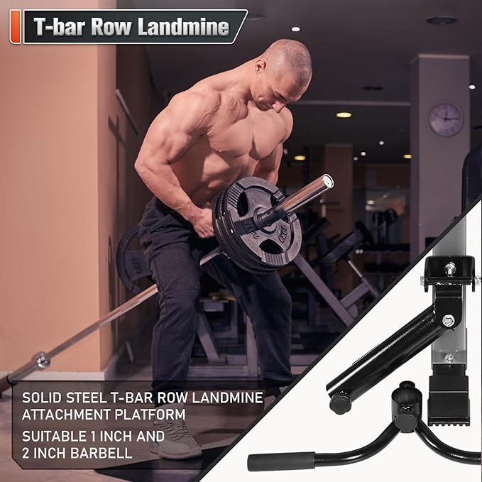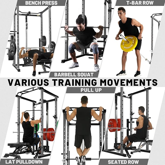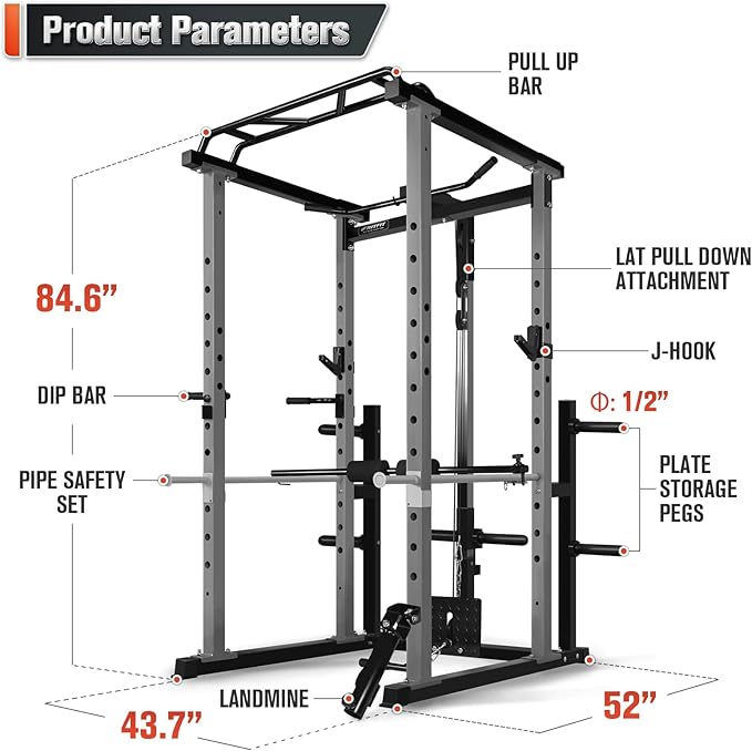 - Unlimited Home Gym Workouts - Equipped with a lat pull down system(high and low pulley) and 13 extra accessories for free(safety bars, J-cups, dip handles, weight holder pegs, pull up bar, T-bars for rowing, Landmine attachments, leg hold-down), it allows you to perform numbers of movements.