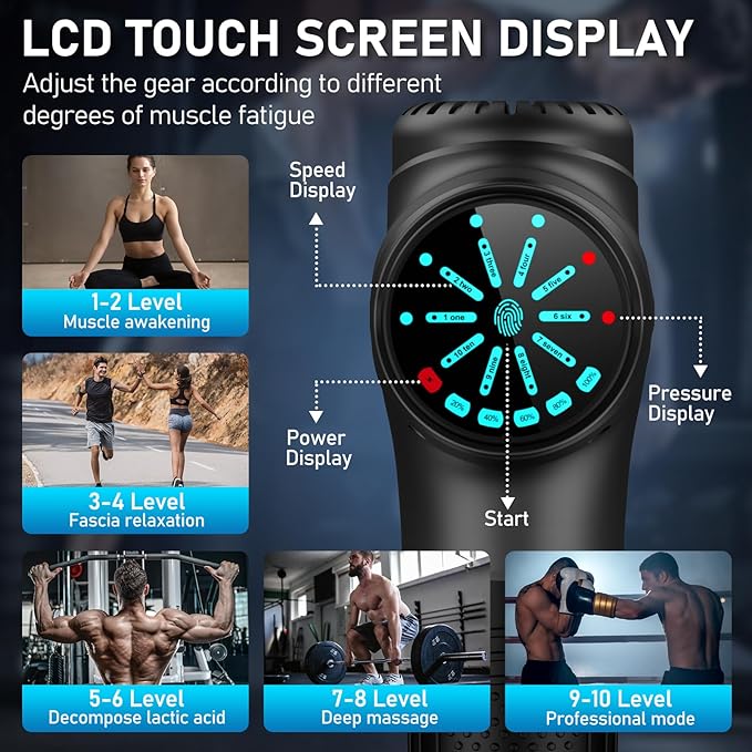 - 10 speed Levels: The handheld massager gun has 10 speeds, which can meet the muscle soreness problems encountered by athletes and fitness professionals. The noise level is only 40 decibels, it won't disturb others