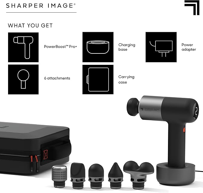 Sharper Image® Powerboost® Pro+ Hot & Cold Deep Tissue Massage Gun - 6 Speeds, 6 Attachments, 5-Hour Battery, Travel Case, Charging Base, Shoulder & Back Massager, Pain Relief Tool, FSA Eligible