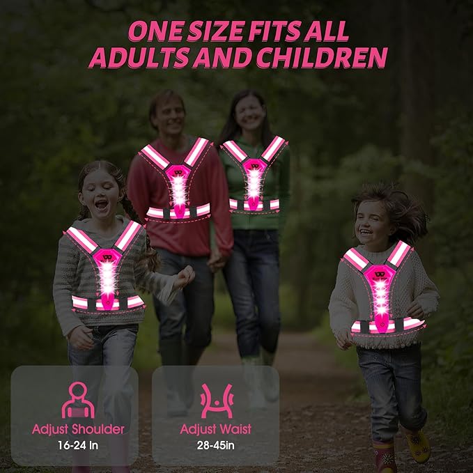 - One Size Fits Everyone - Adjustable night vest for walking use elastic fabrics and high-quality buckles to adjust the length of the strap. The reflective outdoor sport vest shoulder(1.4 cm reflective area) length has been expanded from 16" to 24", and the waist circumference has been expanded from 28" to 45". Just slide the buckle to achieve a size suitable for man/women/adult/teens